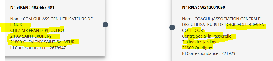 Projet pour une prochaine session de travail : remettre d'équerre nos déclarations au Greffe des Association (n°RNA) et à l'INSEE (n°SIREN).